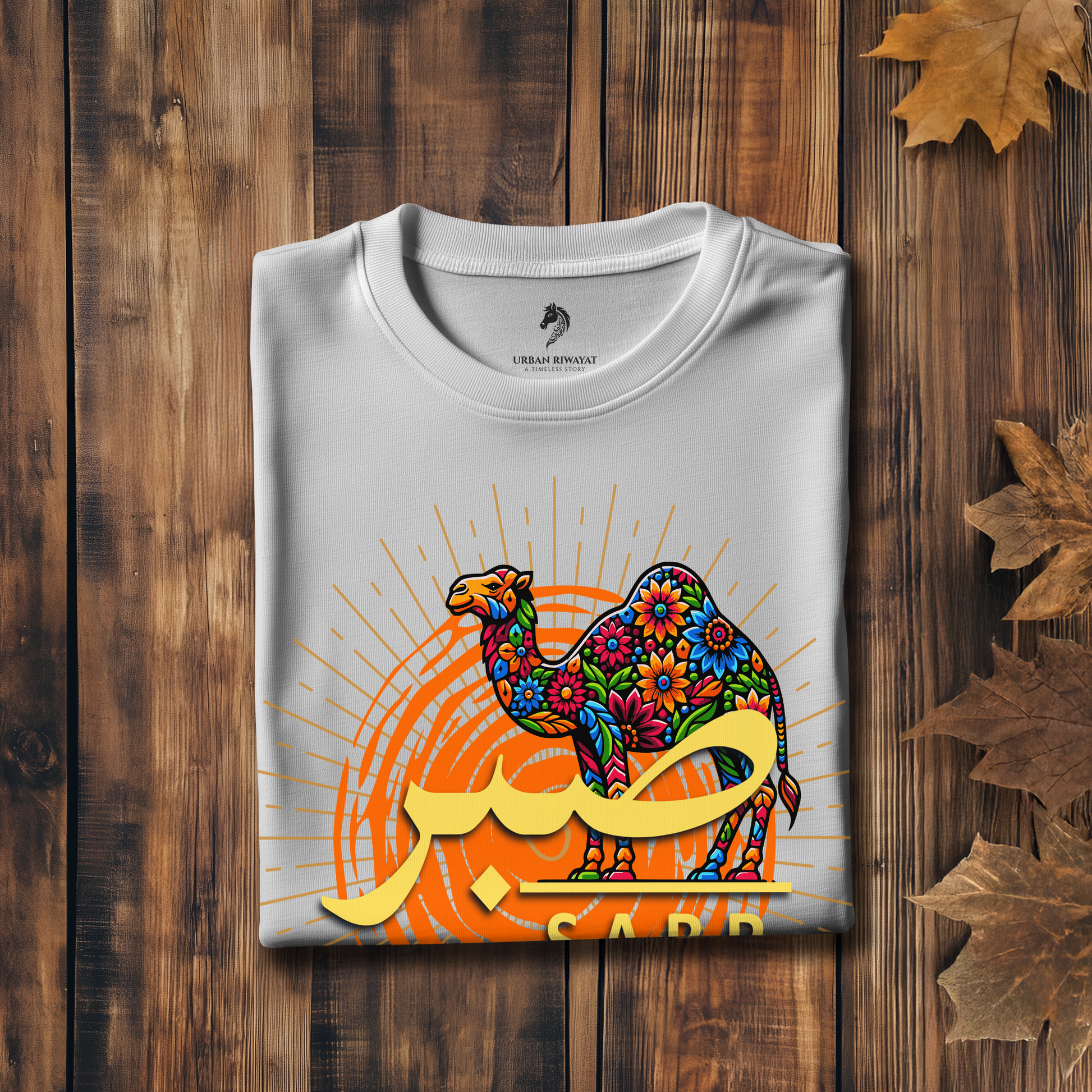 Let your wardrobe speak volumes with this artful take on 'Sabr'. A colourful camel adorned in blooming floral patterns stands tall against a radiant desert sun, symbolising endurance, grace, and growth through trials.